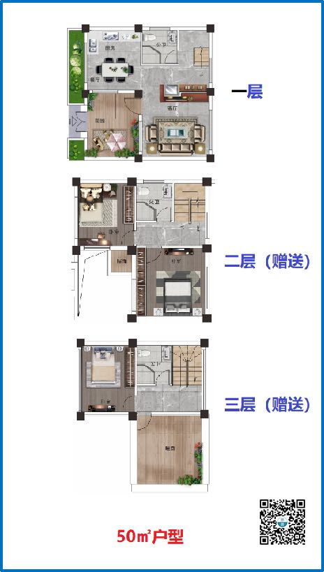 户型3:建筑面积:49.50㎡ 花园面积:14.8㎡ 赠送后实际使用面积:158.75㎡